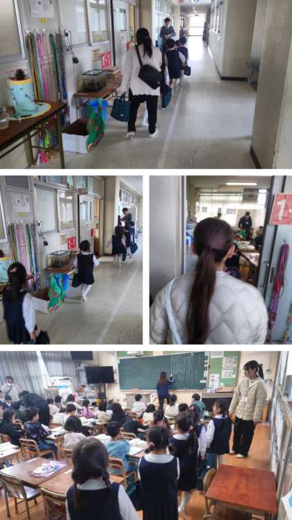 1年生の教室で授業のようすを見たり、職員室や図書室を見学したり、プールをのぞいたりしました。