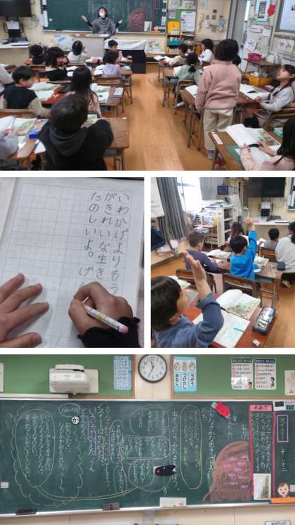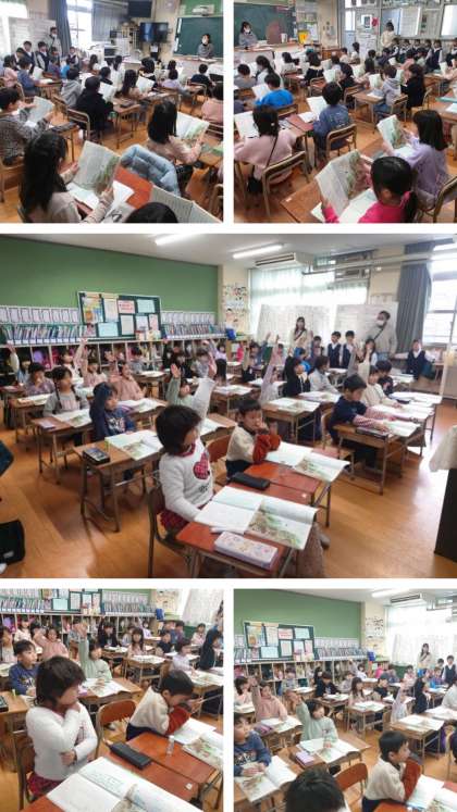 大阪ひがし幼稚園の子どもたちが見ている中、1年生たちははりきって学習していました。