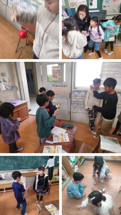 1年生たちが、休み時間にけん玉やこま回しを練習しています。