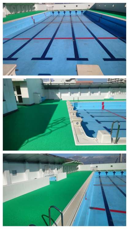 来年度の水泳学習に向けて、プール底面の一部塗装、プールサイドのマットの張り替え、壁の補修、金属部分の塗装などの改装工事を行っていましたが、先日完成しました。
