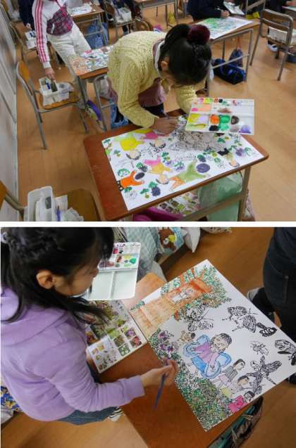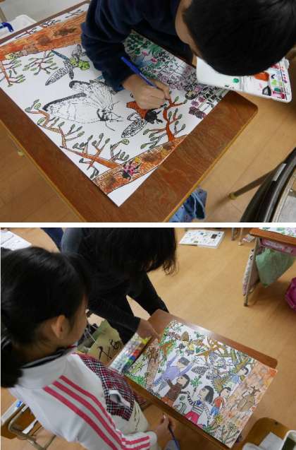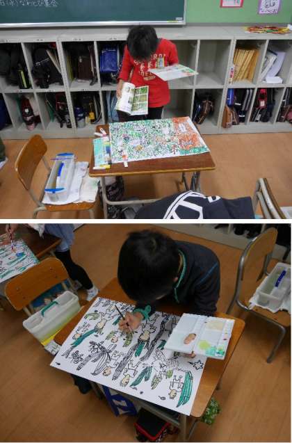 3年生が絵画づくりに集中しています。図鑑をみながら細かいところも調べて描きこんでいます。緻密で迫力ある作品ができあがってきました。