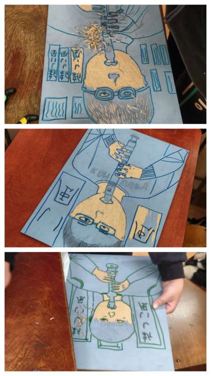 自分がリコーダーをもっている姿をもとに下絵を描き、彫刻刀でていねいに彫っています。