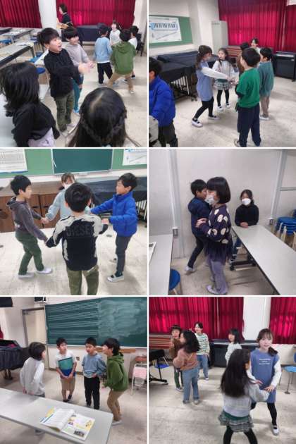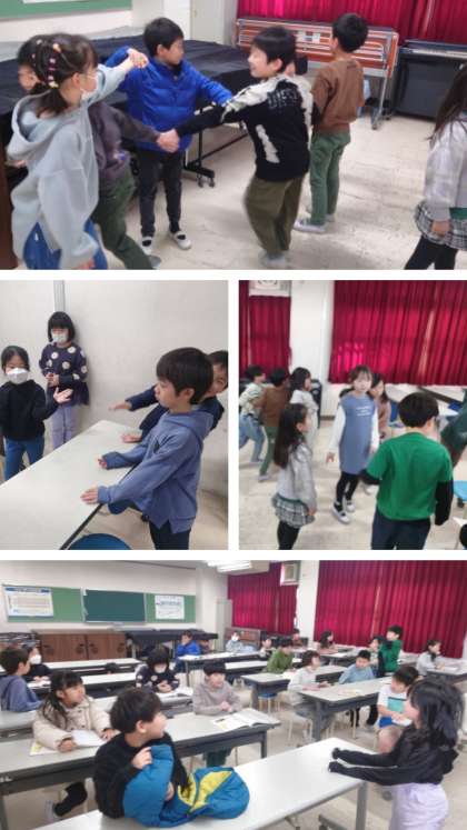 グループで、リズムに合わせた身振りを考えて発表しました。