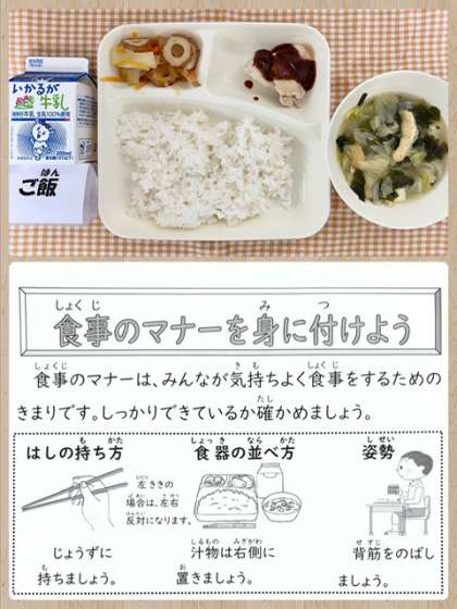 明日の献立は、いわしフライ・みそ汁・牛ひじきそぼろ・ごはん・牛乳です。