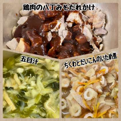 今日の献立は、鶏肉の八丁みそだれかけ・五目汁、ちくわとだいこんのいため煮・ごはん・牛乳でした。