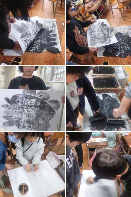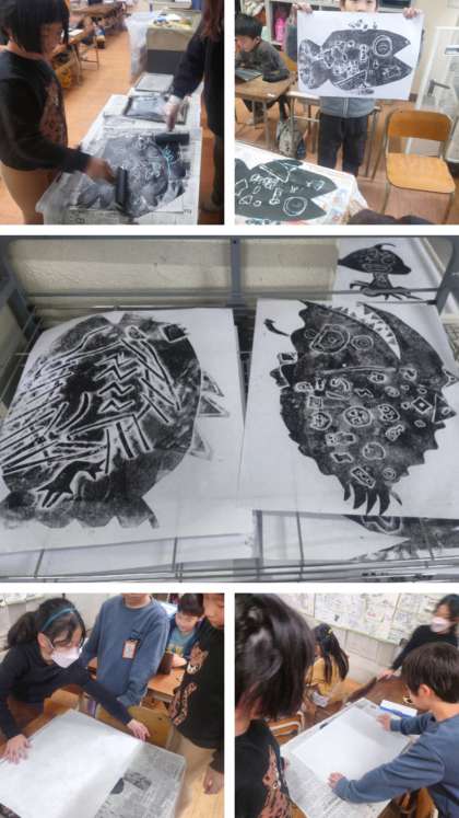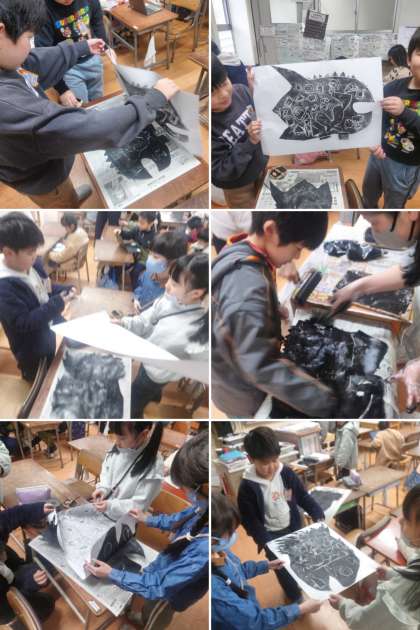 図工科の時間は、「魚」を題材に、紙版画の作品を制作しています。