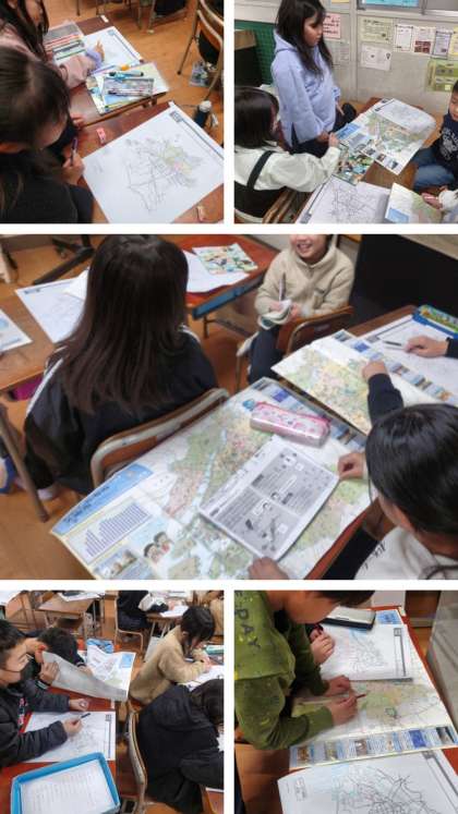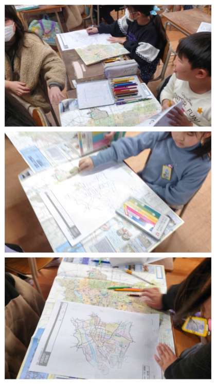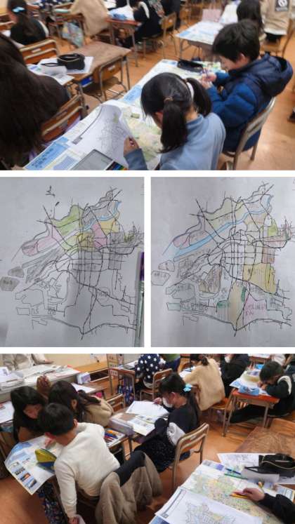 社会科の時間は、大阪市の区を色分けしたり、これまでに習ったところや有名な場所などを白地図に書き込んでいきました。