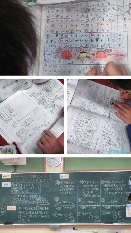 今日は、いろいろな問題文を作って、それに合う図や式を考えました。