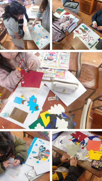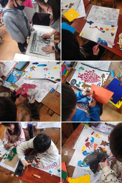 図画工作科の時間は、色の紙を切って台紙に貼って、紙版画の作品を制作しています。