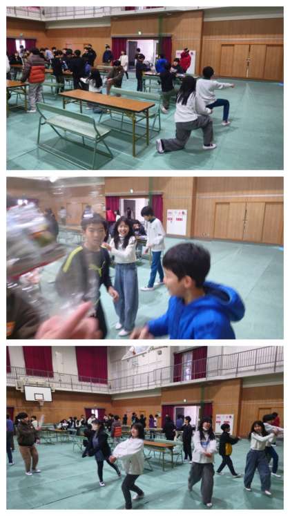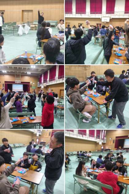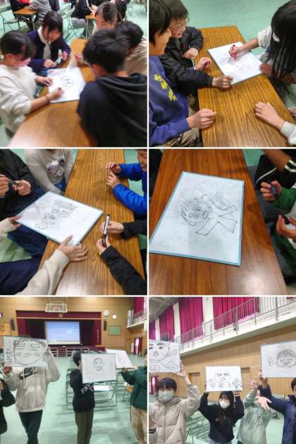 はじめの言葉に続き、講堂の中では「じゃんけん列車」「10秒絵描き」を楽しみました。