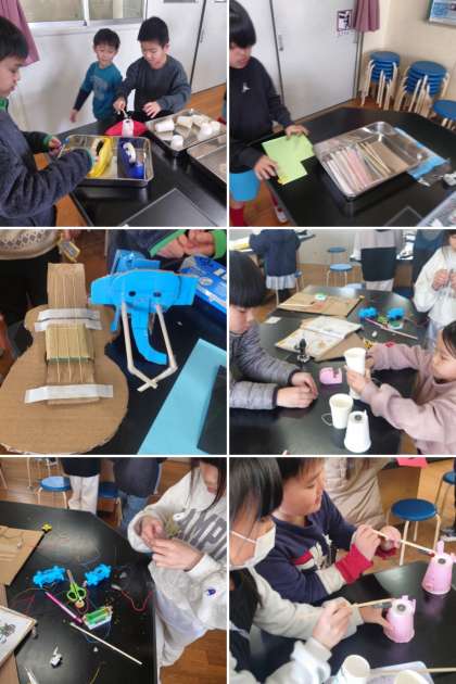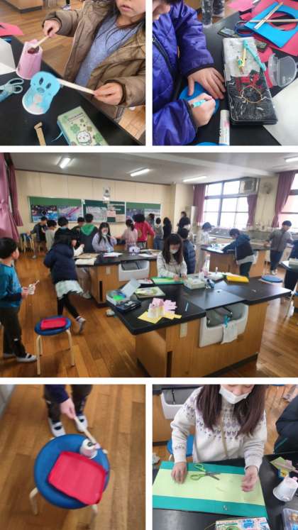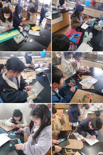 理科の時間は、これまで学習したことをもとに、おもちゃ作りをしています。