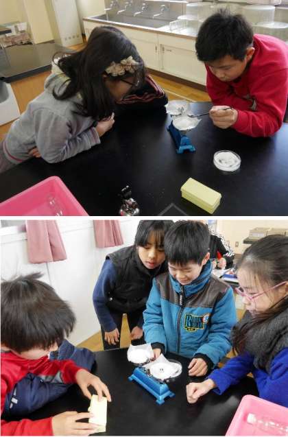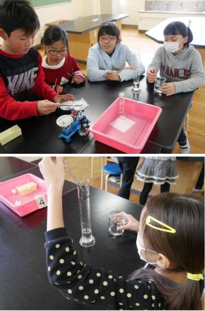 5年生が、上皿てんびんで食塩の重さを正確に測っています。その食塩を水に溶かしています。さて。実験の結果はいかに・・・自分で調べて学習するのは楽しいね。
