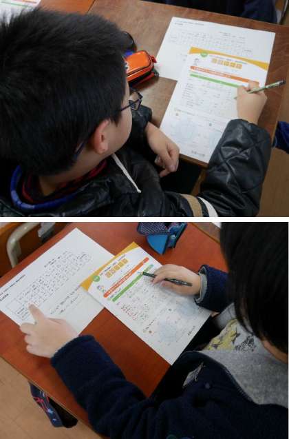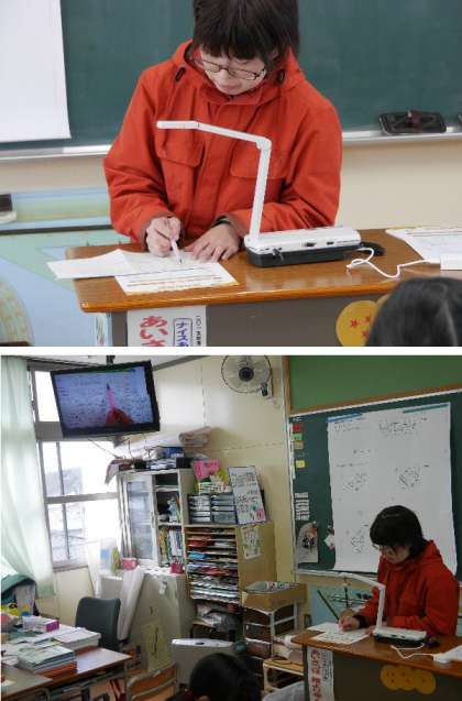 春に実施した体力テストの結果を全国体力テストの記録用紙に書いています。ワイヤレス書画カメラで映し出された画面で、先生が説明をしています。全国の平均と比べてみると、自分の体力のようすがよくわかりますね。