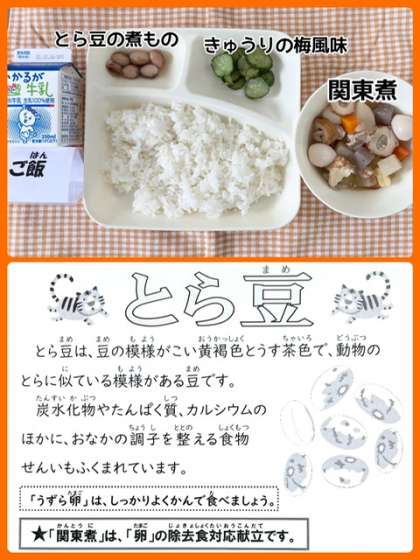 今日の献立は、関東煮・きゅうりの梅風味・とら豆の煮もの・ごはん・牛乳でした。
