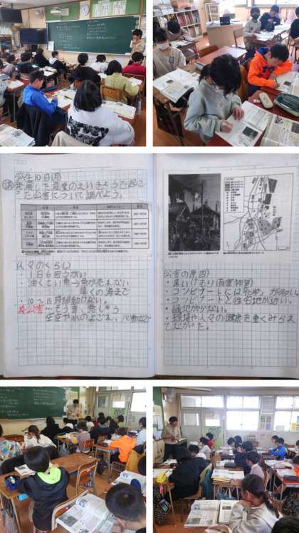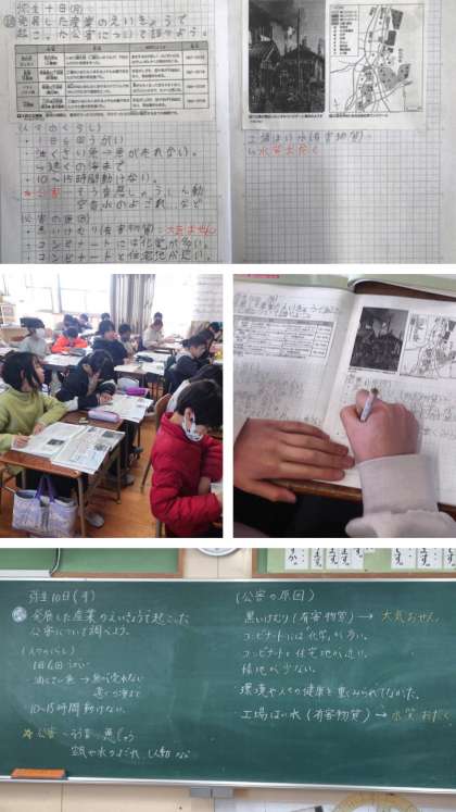社会科の時間は、産業の影響で起こった公害について、人々のくらしにどんな影響があったか、そして、公害の原因は何かについて調べました。