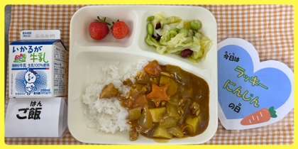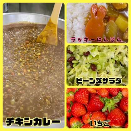 今日の献立は、チキンカレーライス・ビーンズサラダ・いちご・牛乳でした。