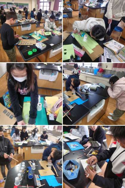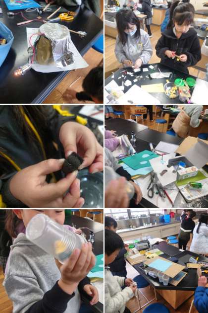 理科の時間は、これまで学習したことをもとに、おもちゃ作りをしています。