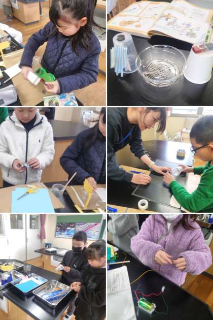 じしゃく、空気、ゴムの性質や電気のはたらきを使って、おもちゃをつくっています。