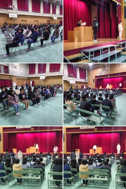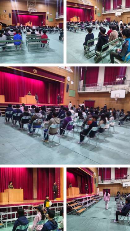 今日は、5・6年生で講堂に集まり、証書授与などの練習をしました。