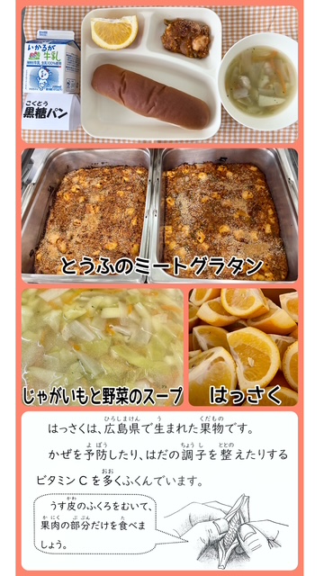 今日の献立は、とうふのミートグラタン・じゃがいもと野菜のスープ・はっさく・黒糖パン・牛乳でした。