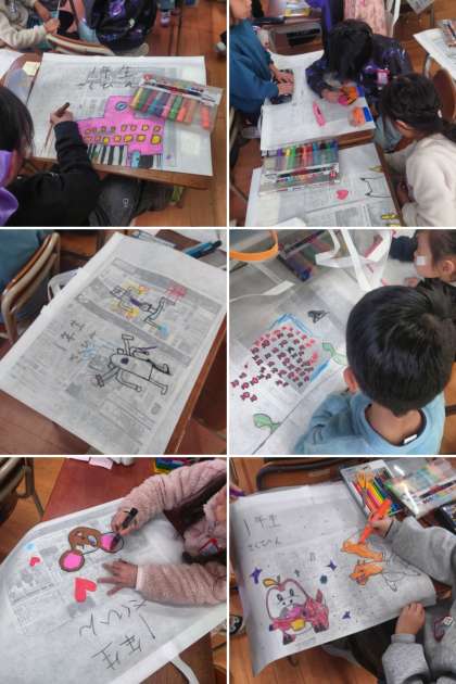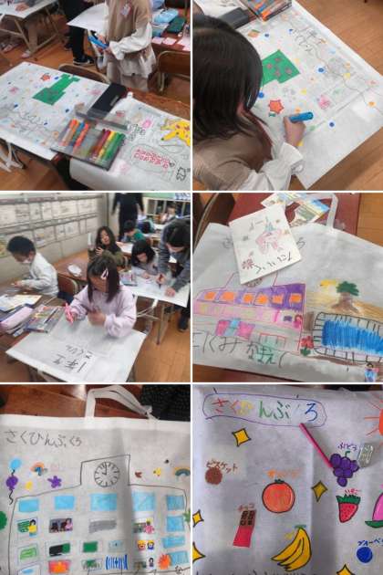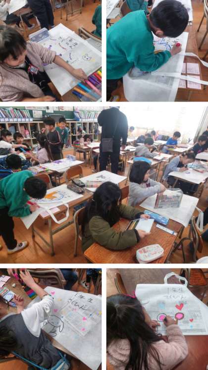子どもたちは、1年間の作品を入れて持って帰る「作品袋」に思い思いの絵を描いています。