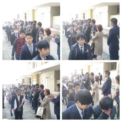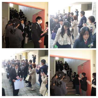 5年生や保護者の方と教職員でつくった花道を通って、正門へ。