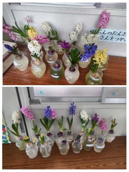 1年生の教室の前で育てているヒヤシンスの水栽培。