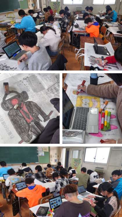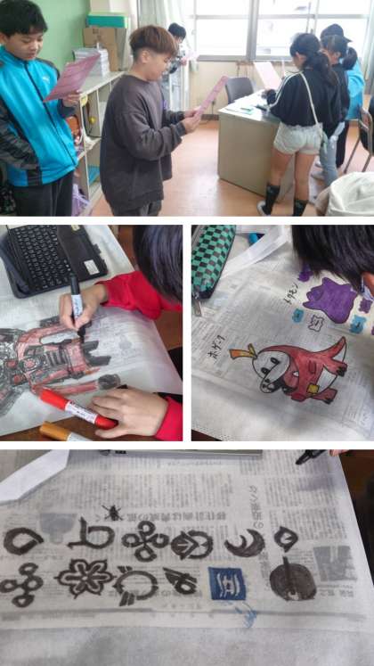 子どもたちは、1年間の作品を入れて持って帰る「作品袋」に思い思いの絵を描いています。
