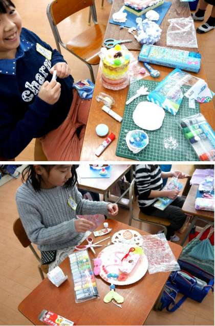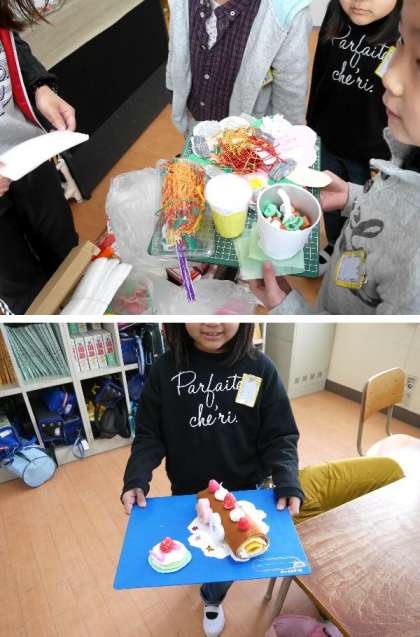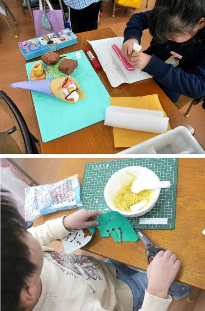 3年生が作品展にむけて一生懸命に作ってがんばっています。ケーキにラーメン、クレープ、とってもよくできていますね。おいしそうです。