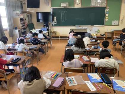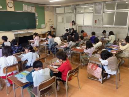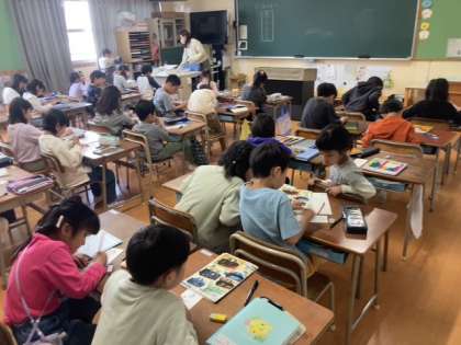 見本を見ながら名前をペンで書き、周りにイラストや模様を描いていました。
