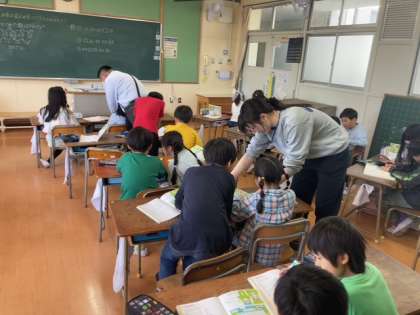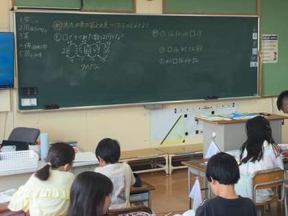 かけ算の答えの特徴について考えています。ペアの子と話合いながら、学習を進めていました。
