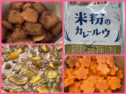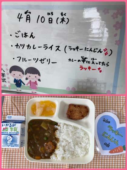 一ロトンカツは、一個30gのものを使用し、配食時に牛肉を主材としたカレーライスに添えます。入学祝い献立にふさわしいラッキーにんじんをたくさん作っていただきました。