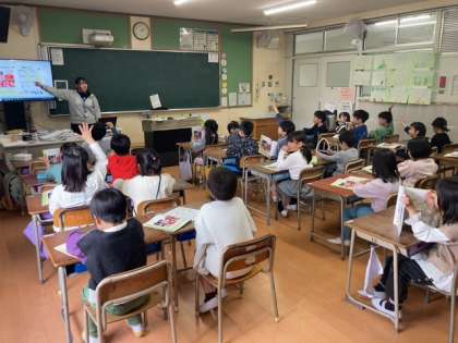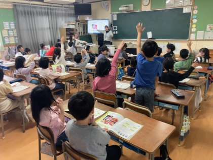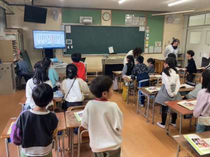 今年度初めての授業。先生の自己紹介を聞いたり、みんなで楽しく歌を歌ったりしていました。