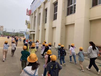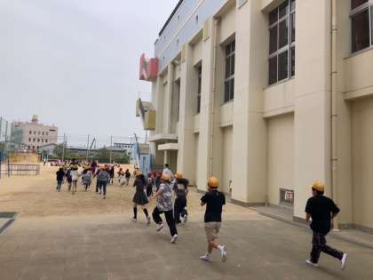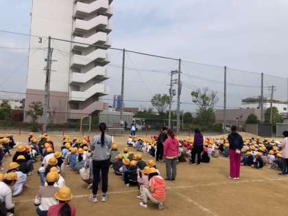 今年度初めての避難訓練。避難する時は、「おはしも(おさない、はしらない、しゃべらない、)を意識するよう指導しています。スムーズに運動場に避難できました。