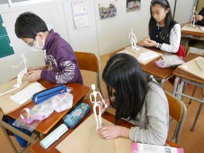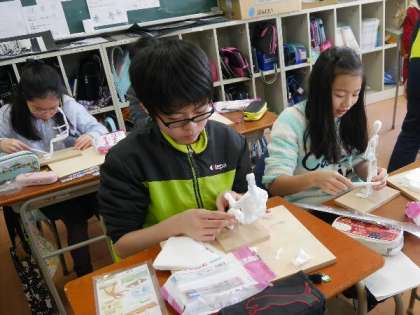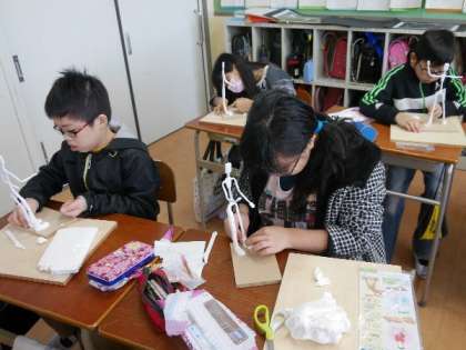 6年生が人形芯棒に紙粘土をまいて、将来なりたい自分を作っています。作品展に展示するのでお楽しみに!今、6年生では、いろいろな仕事についての学習をおこなっています。どんな仕事があって、どんな資格が必要で、どんな苦労や生きがいなど、ビデオなどをつかって調べています。