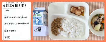 ?今日の献立は、鶏肉とじゃがいもの煮もの、あつあげのしょうゆだれかけ・紅さけそぼろ・ごはん・牛乳でした。