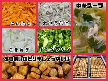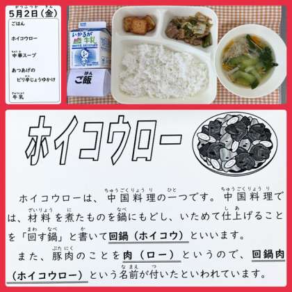 ?今日の献立は、ホイコウロー・中華スープ・あつあげのピリ辛じょうゆかけ・ごはん・牛乳でした。