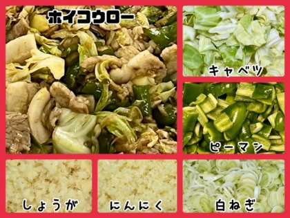 「ホイコウロー」は、よくゆで、料理酒で下味をつけた豚肉(ばら)を主材にキャベツ、ピーマンを使用したいためものです。しょうが、にんにく、白ねぎで風味を加え、テンメンジャン、砂糖、塩、こいくちしょうゆを合わせた調味料で味つけしています。