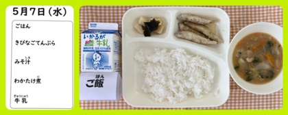 ?今日の献立は、きびなごてんぷら・みそ汁・わかたけ煮・ごはん・牛乳でした。