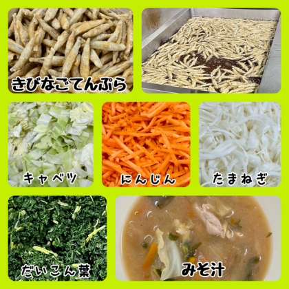 「みそ汁」は、鶏肉、キャベツ、たまねぎ、にんじん、青みにだいこん葉(乾)を使っています。