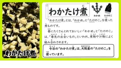 春に収穫されるたけのことわかめは、『春先の出会いもの』といわれ、煮ものや汁ものによく組み合わされています。給食では、「わかたけ煮」として煮ものにしています。
