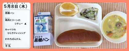 ?今日の献立は、鶏肉とコーンのシチュー・キャベツのひじきドレッシング・かわちばんかん・黒糖パン・牛乳でした。