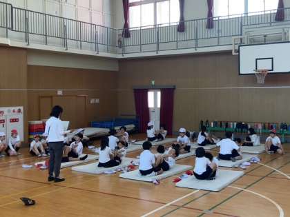 2時間目は、講堂で反復横跳びや上体起こしに挑戦しました。