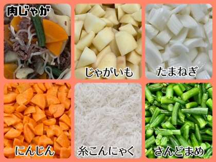 「肉じゃが」は、牛肉を主材にじゃがいも、糸こんにゃく、たまねぎ、にんじん、青みにさんどまめを使用した毎回好評な定番の煮ものです。