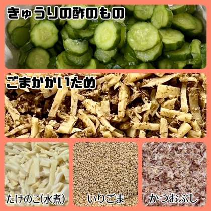 「きゅうりの酢のもの」は、焼き物機で蒸したきゅうりに砂糖、塩、米酢で作ったタレをかけ、あえたものです。