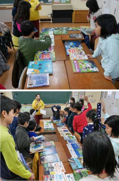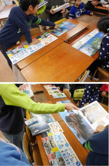 4年生が図書室などから調べ学習用の本を選んでいます。環境についての本が多いですね。省エネや、食糧自給率などの本が並んでいます。
