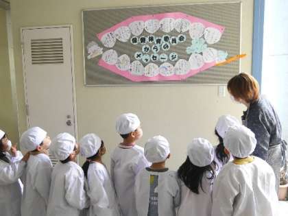 保健委員会のメッセージが掲示板に貼られています。虫歯予防について注意しようというコメントです。「目標は80歳で20本」「歯みがき毎日朝晩ピカピカ」