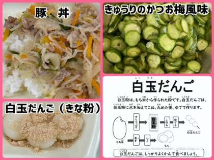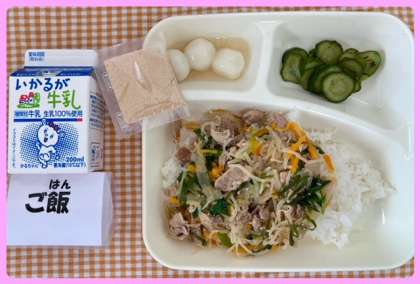 ?今日の献立は、豚丼・きゅうりのかつお梅風味・白玉だんご(きな粉・袋)・牛乳でした。