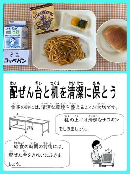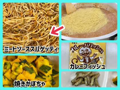 ??今日の献立は、ミートソーススパゲッティ・焼きかぼちゃ・カレーフィッシュ・ミニコッペパン・牛乳でした。