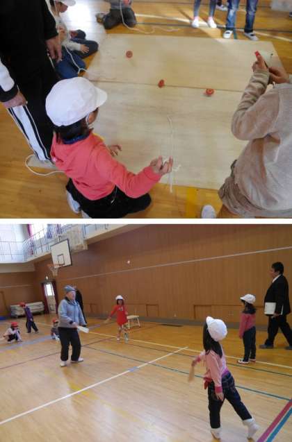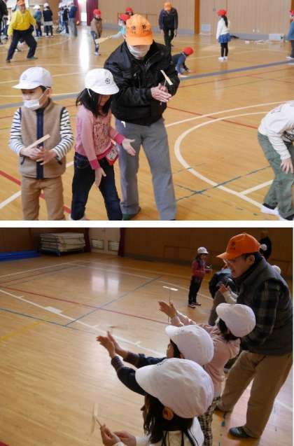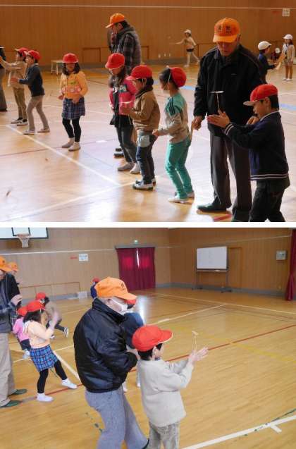 地域の方に昔あそびを一緒に遊びながら教えてもらいました。とてもやさしく丁寧に教えていただきありがとうございました。
